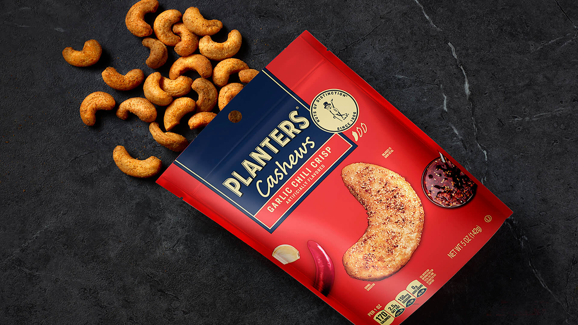 With an MSRP of $4.29–$4.99, PLANTERS® Garlic Chili Crisp flavored cashews deliver bold flavor anytime, anywhere.