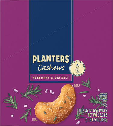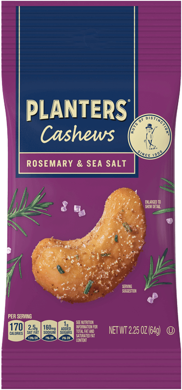 Elevate your snack game with PLANTERS® Cashews Rosemary & Sea Salt. These creamy cashews are roasted in peanut oil for a rich crunch, then seasoned with savory sea salt and aromatic rosemary for a gourmet flavor experience. Whether you’re hosting a gathering or need a quick bite between meetings, they deliver bold taste in every handful.